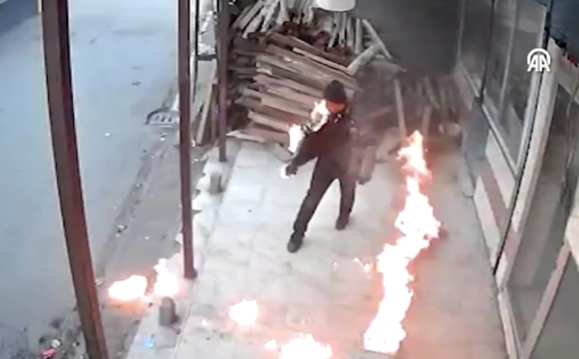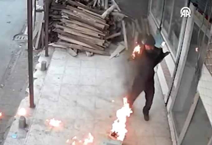 İş yeri sahibinin yanmaktan son anda kurtulması, güvenlik kamerasınca kaydedildi.