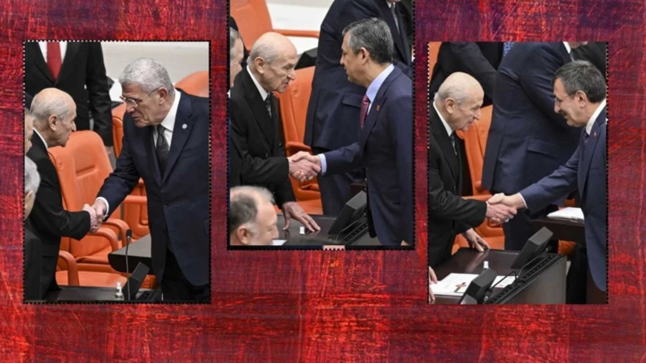 İYİ Parti Genel Başkanı Dervişoğlu ile CHP Genel Başkanı Özel, görüşmeler öncesinde MHP Genel Başkanı Devlet Bahçeli’nin yanına giderek tokalaştı. AK Parti Genel Başkanvekili Efkan Ala da Bahçeli, Dervişoğlu ve Bakırhan ile selamlaştı.