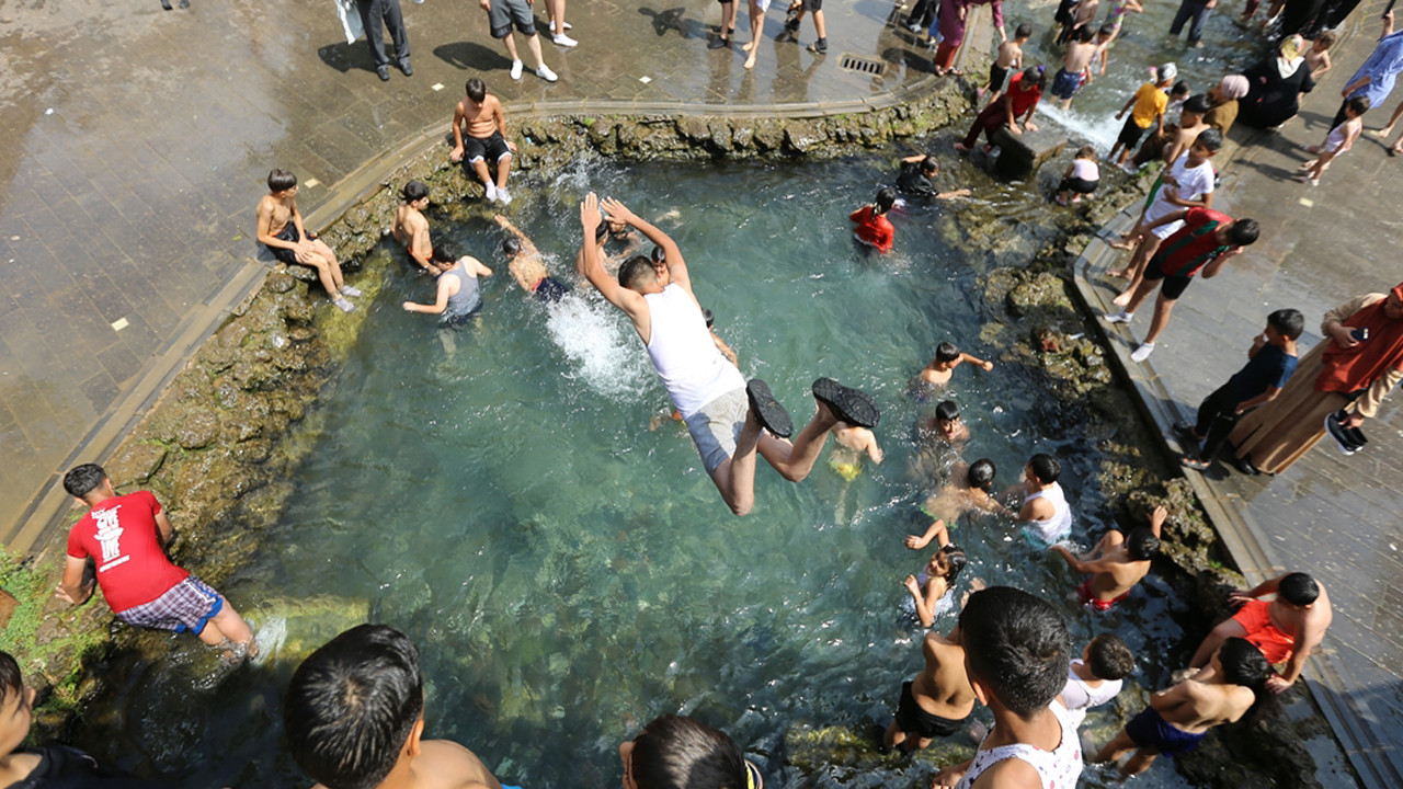 Kentte etkili olan sıcak hava nedeniyle çocuklar, merkez Sur ilçesindeki Anzele Parkı'nda bulunan süs havuzuna girerek serinlemeye çalıştı.