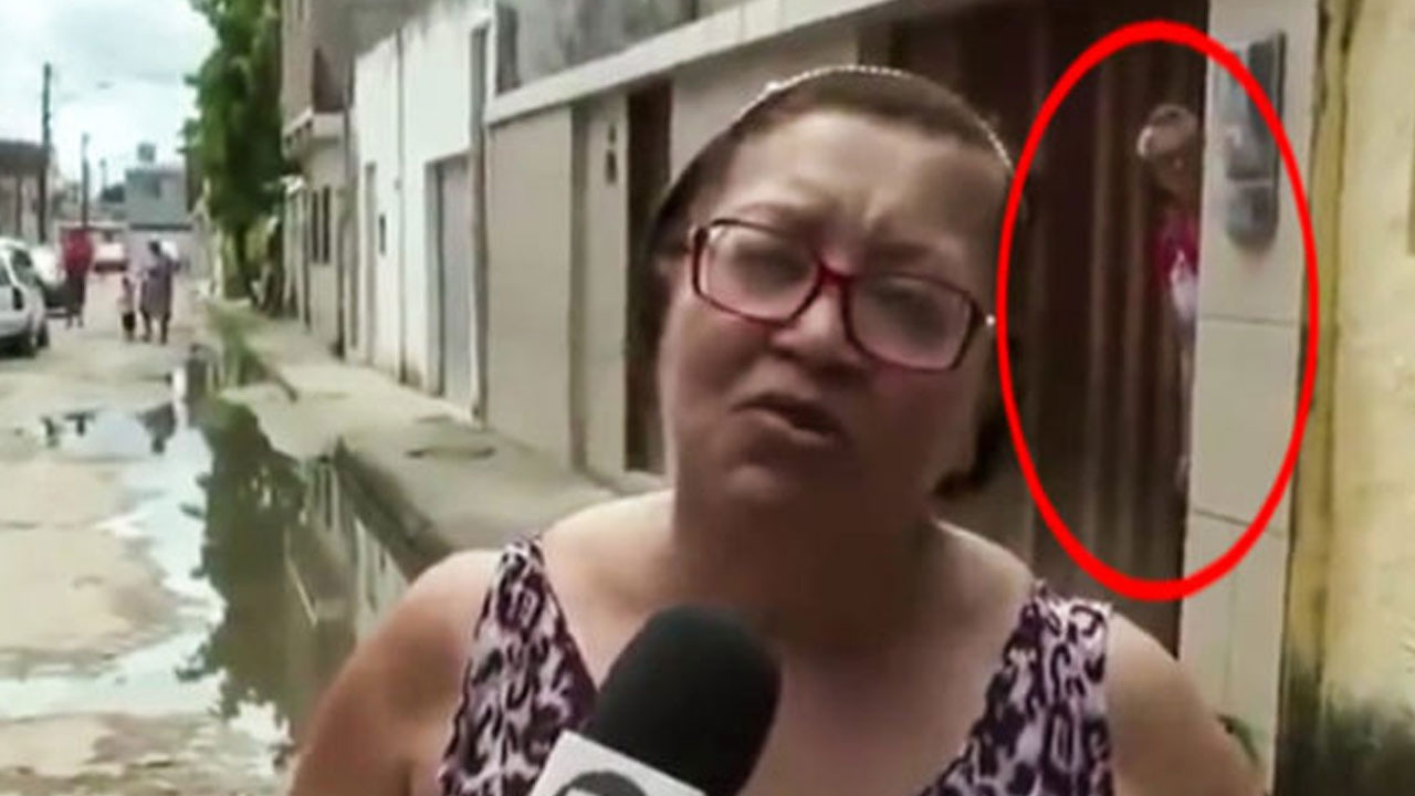 Brezilya'da bir televizyon kanalı muhabirinin mahalle içinde röportaj yaptığı sırada görüntünün arkasında beklenmedik bir sürpriz yaşandı. O anlar röportaj sırasında kamera kaydına yansıdı.
