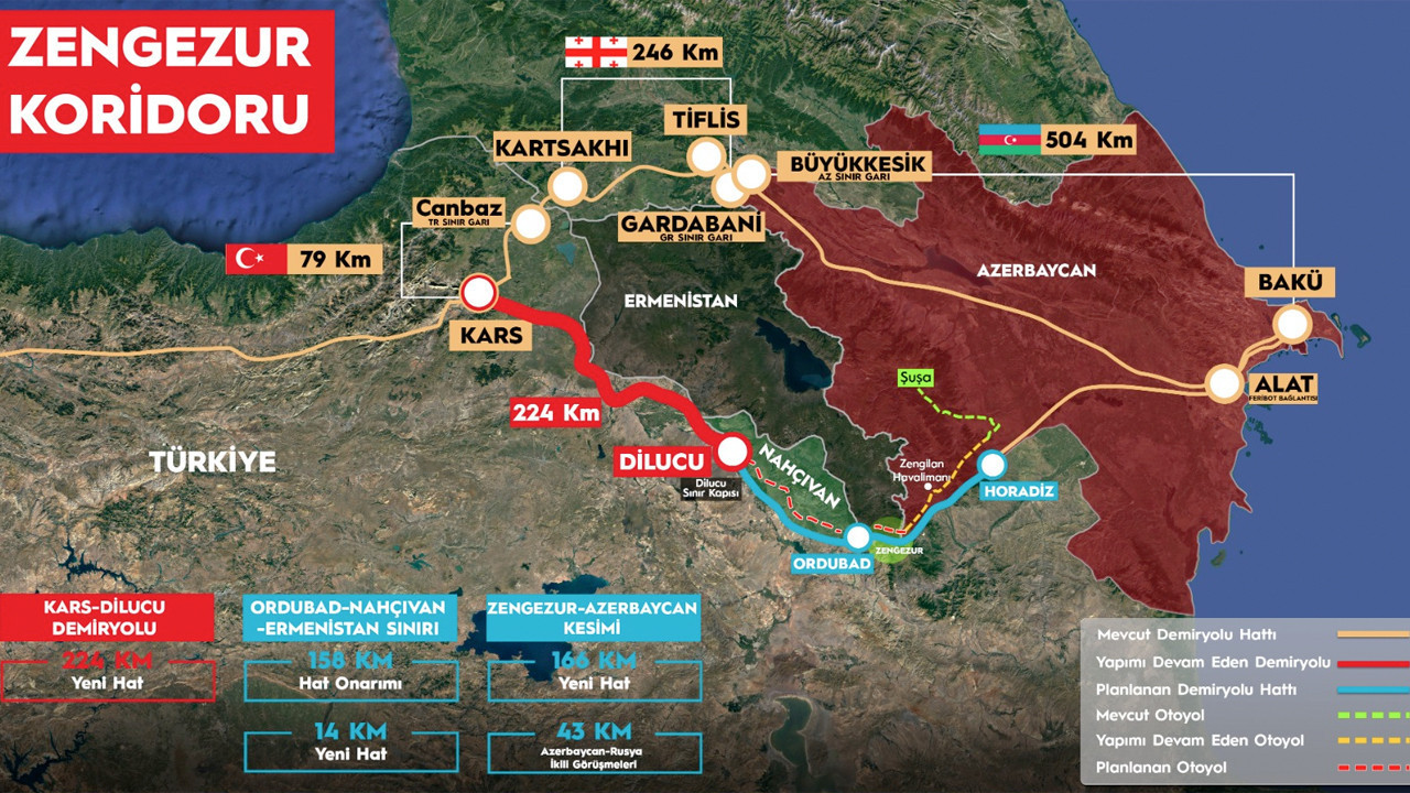Ulaştırma ve Altyapı Bakanı Abdulkadir Uraloğlu, Kars-Iğdır-Aralık-Dilucu Demiryolu Hattı’nın temelinin 22 Ağustos Cuma günü atılacağını duyurdu. Bakan Uraloğlu, 224 kilometrelik hattın Zengezur Koridoru’nun önemli bir parçası olduğunu belirterek “Zengezur Koridoru’nun işlerlik kazanmasıyla birlikte Pekin’den Londra’ya kadar uzanan doğu-batı hattı daha verimli işleyecek.” dedi.
